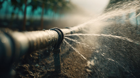 A close-up view of an irrigation pipe spraying water onto a dry field, highlighting the importance of water management in agriculture for crop growth and sustainability.