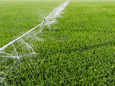 Irrigation of a green field with crops by water.