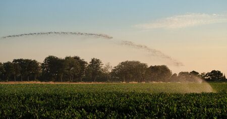 Irrigation of a corn field from irrigation installations.
