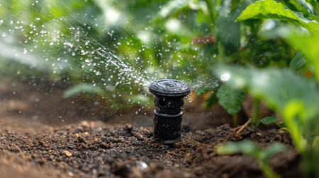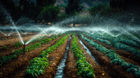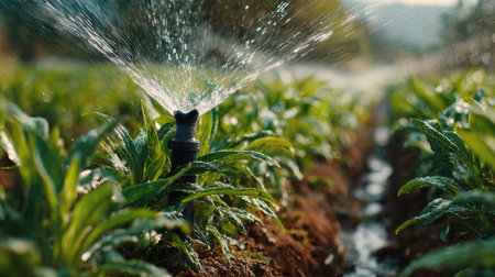 A close-up view of a modern sprinkler system spraying water over a green agricultural field. The scene captures the essence of effective irrigation, highlighting the vibrant growth of plants under natural light. The image represents sustainable farming practices and the importance of water management in agriculture.