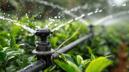 This captivating close-up image showcases a drip irrigation system actively spraying water on vibrant green tea plants. The glistening droplets emphasize the importance of water in agriculture, highlighting modern farming techniques that promote sustainable growth and productivity in rural landscapes.