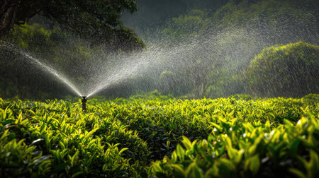 A vibrant sprinkler system efficiently waters lush green tea plants, showcasing the interaction of technology and nature in a serene landscape.