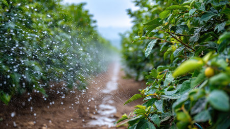 A close-up view of a drip irrigation system in action, showcasing water spraying gently in a vibrant agricultural field, creating a serene atmosphere.