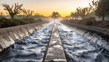 Sunset view of irrigation canals in the fields