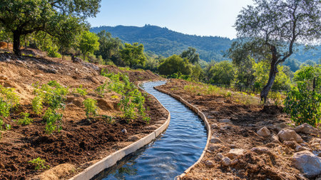 Hand-dug swales on sloped land for water conservation in sustainable agriculture, visible contour lines and copy space
