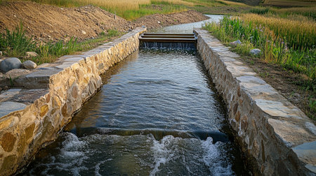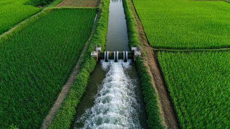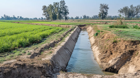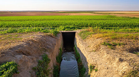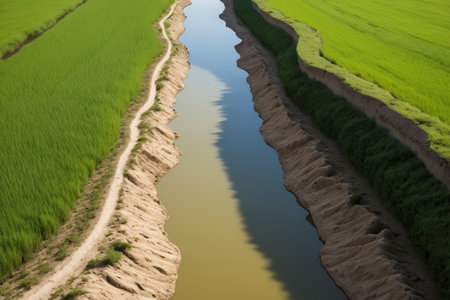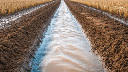 flooded irrigation canal overflowing into adjacent field, created with generative ai