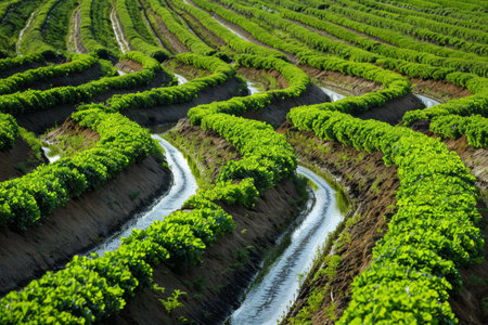 Vines thriving in a vineyard with water flowing through a complex irrigation system, Intricate irrigation system snaking its way between the rows of crops