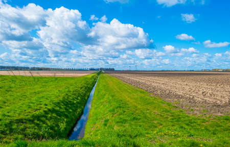 Furrows in an agricultural field in a rural area below a blue bright cloudy sky in spring, Almere, Flevoland, The Netherlands, April 13, 2021