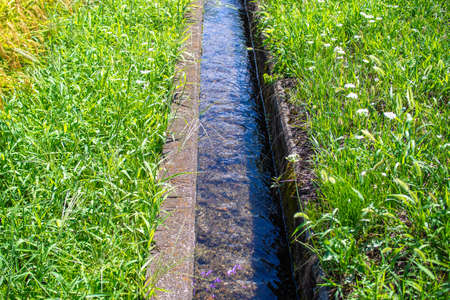 Flowing water in a diversionary channel bordered by trails in the middle of a meadow on a sunny day in the Italian countryside