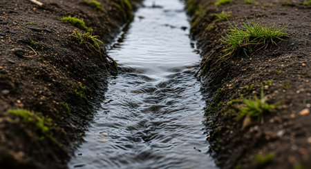 A small stream of clear water flows through an irrigation ditch cut into dark soil in a farm field. The perspective looks down the channel, highlighting water management and hydration in agriculture.