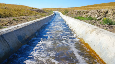 This image features a serene view of flowing water in a concrete canal, perfect for illustrating agricultural irrigation systems in rural landscapes.