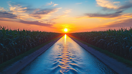 A serene irrigation channel meanders through a lush crop field, showcasing the harmony between agriculture and nature under gentle evening light.