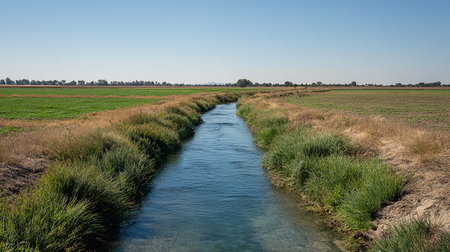A serene view of water flowing through an irrigated field, showcasing the lush greenery under a clear blue sky, highlighting sustainable agriculture practices.