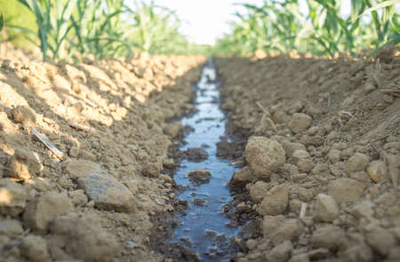 Water canal between cultivated fields used for crop irrigation, selective focus