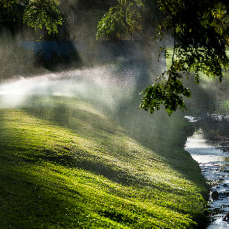Morning sun with sprinklers on