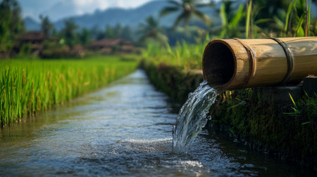 Long irrigation pipeline runs through a vibrant paddy field, carrying water for the crops. The pipeline is positioned centrally in the image and is seen in motion. Lush green rice paddy fields extend into the background.