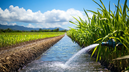 An automated system waters lush green rice plants, creating a vibrant scene. Water flows from the hose, droplets glistening under soft sunlight, enhancing agricultural productivity.