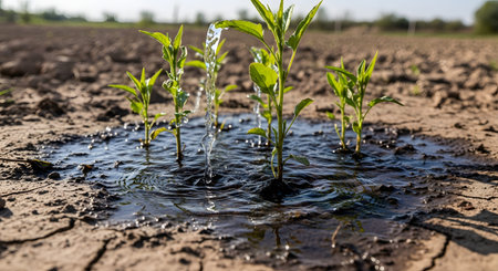 Water being poured onto young green plants growing in dry, cracked earth, symbolizing hope and survival. The dramatic contrast highlights drought conditions, water scarcity, and the resilience of nature.