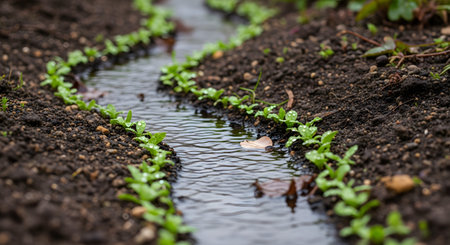 A small irrigation channel flows between rows of young green seedlings in a farm field. The water nourishes the dark, fertile soil, highlighting the beginning of the crop growth cycle.