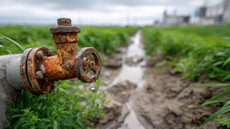 A close-up view of a rusty water valve dripping water, with a lush green agricultural field in the background, highlighting the importance of irrigation.