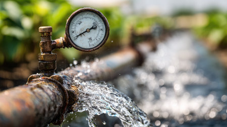 A detailed close-up of a water pressure gauge mounted on a rusty pipe, showing a strong flow of water in an agricultural setting, highlighting irrigation technology.