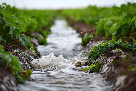 Irrigation water flowing over green vegetable crops