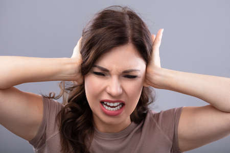 Girl in her mid 20's covering ears, suffering from loud noise, unhappy female feeling pain