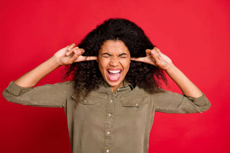 Photo of screaming shouting mad irritated model wearing green shirt shutting her ears about to cry isolated over vivid color background