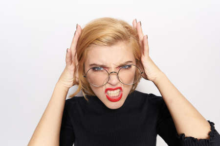 Cute blonde in glasses bright makeup black jacket cropped view light background emotions