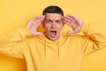 Desperate Caucasian man wearing casual style hoodie, posing isolated over yellow background, standing with angry expressing and raised arms, screaming with aggression.