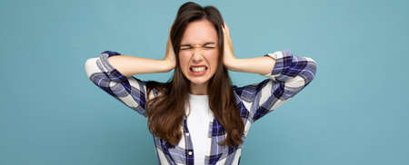 Panoramic photo. Young emotional angry beautiful brunette woman wearing check shirt isolated on blue background with copy space and covering ears.