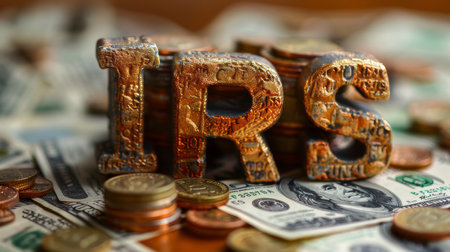 Close-up of bronzed IRS letters among assorted US currency and coins, highlighting the financial obligations and tax concepts in America.