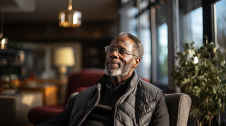 Portrait of a mature African man with a gray beard and hair, wearing eyeglasses and a black shirt, confidently looking camera. Blurred background copy space. Stylish professional.