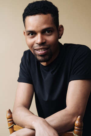 Young African American man wearing casual clothes looking at camera with smile on face, natural expression on beige background