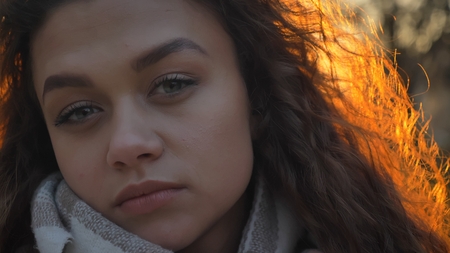Close-up portrait of pretty curly-haired caucasian girl watching seriously and directly into camera in sunny autumnal park.