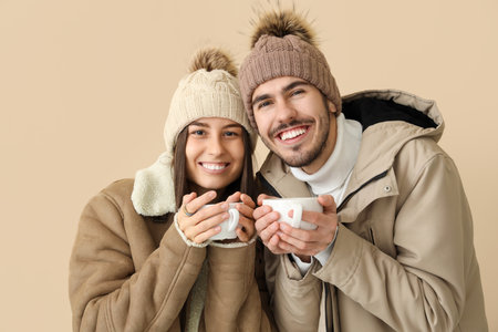 Loving couple in winter clothes with cups of hot tea on beige background