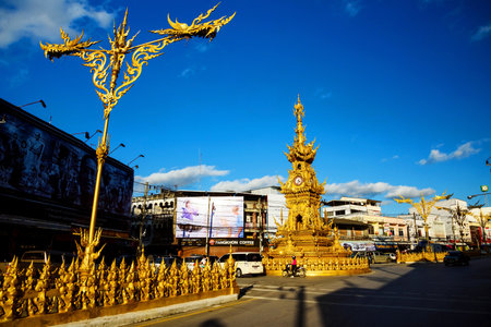 CHIANG RAI, THAILAND - JANUARY 07, 2017: The golden clock tower, the famous landmark, with the late King Bhumibol billboard on the city square of Chiang Rai.