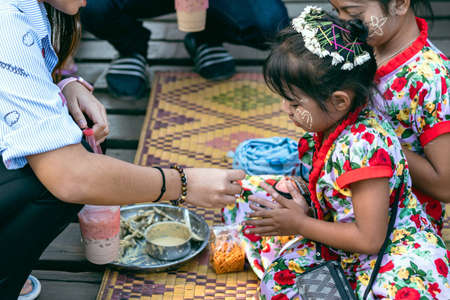 KANCHANABURI THAILAND-DECEMBER 31,2019 : Unidentified Mon girl sells flowers and make tanaka powdering service to tourists on Uttamanusorn wooden bridge across the river in morning at Sangkhlaburi.