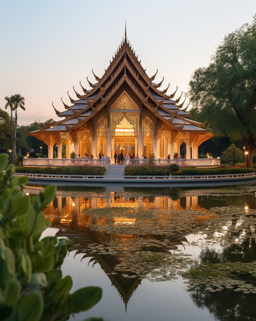 Experience the breathtaking sight of a beautifully illuminated temple at night, reflecting on tranquil waters. This serene landscape captures the essence of Thai culture and architecture, inviting viewers to embrace peace and beauty.