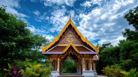 This stunning image features a traditional Thai temple adorned with intricate designs, set against a vibrant sky and surrounded by lush greenery, capturing serenity.