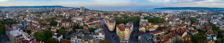 Amazing colorful sunset over the city. aerial panoramic view from drone, Varna city, Bulgaria