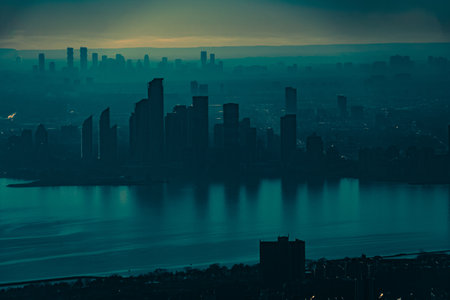 City skyline featuring modern and classic architecture, with prominent skyscrapers and urban buildings with colorful bright colors, capturing the essence of metropolitan life and architectural diversity.