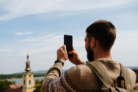 Man photographing or making video Zemun church with smartphone, view of river and town. Rear view
