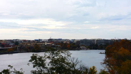 View of the Georgetown neighborhood of Northwest Washington, DC, as seen from a distance. Trees with autumn-colored leaves in the foreground, along the Potomac River waterfront in Arlington, VA.