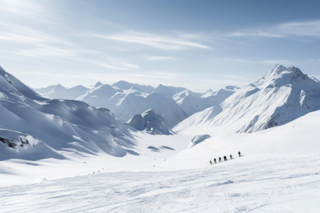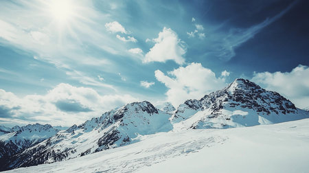 A breathtaking view of snow-covered mountains under a bright, partly cloudy sky. The landscape is pristine, with the sun casting a soft glow on the peaks.