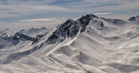 Snowy mountains under cloudy sky. Caucasus Mountains, Georgia, region Gudauri.