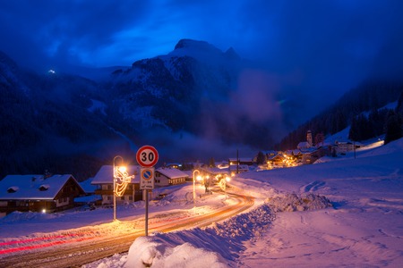 Fantastic evening winter landscape. Colorful overcast sky. Austria, Europe. Beauty world.