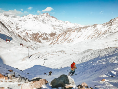 Ski lift in Almaty mountains. Shymbulak Ski Resort Hotel now-capped Tian Shan in Almaty city, Kazakhstan, Central Asia.