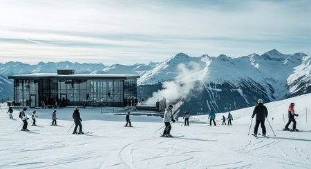 snowy mountain range, with skiers and snowboarders enjoying the winter landscape, created with generative ai