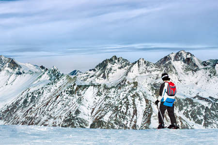 People Skier skiing at ski resort Penken Park in Tyrol in Mayrhofen in Zillertal valley of Austria in winter Alps. Men ski Alpine mountains with white snow and blue sky. Austrian snowy slopes.